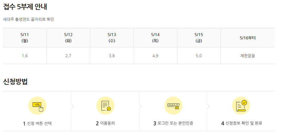 ▶ 신청초기에는 [ 5부제 ]로 신청인의 생년 끝번에 따라 신청 요일이 다르다.