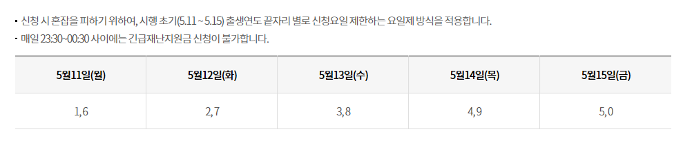 ▶ 그러므로 어디로 지급받을지 정한다음, 온라인 신청과 오프라인신청 중 하나를 선택해야한다. 그리고 신청초기에 본인(신청인-원칙:세대주)의 생년 끝번에 따른 5부제 적용 신청요일이 언제인지 파악해야 한다.