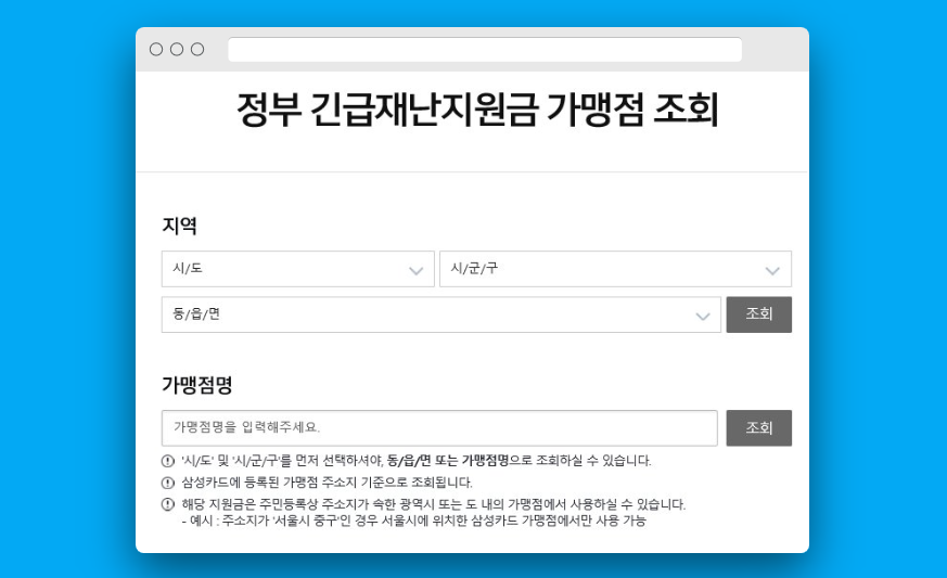 ▶ 삼성카드에서 제공하는 "정부 긴급재난지원금 가맹점 조회" 사이트에 접속해서 어느 매장에서 사용할 수 있는지 직접 조회하면 된다. 로그인 하지 않아도 사용 가능하며, PC와 휴대폰으로 쉽게 검색할 수 있다.