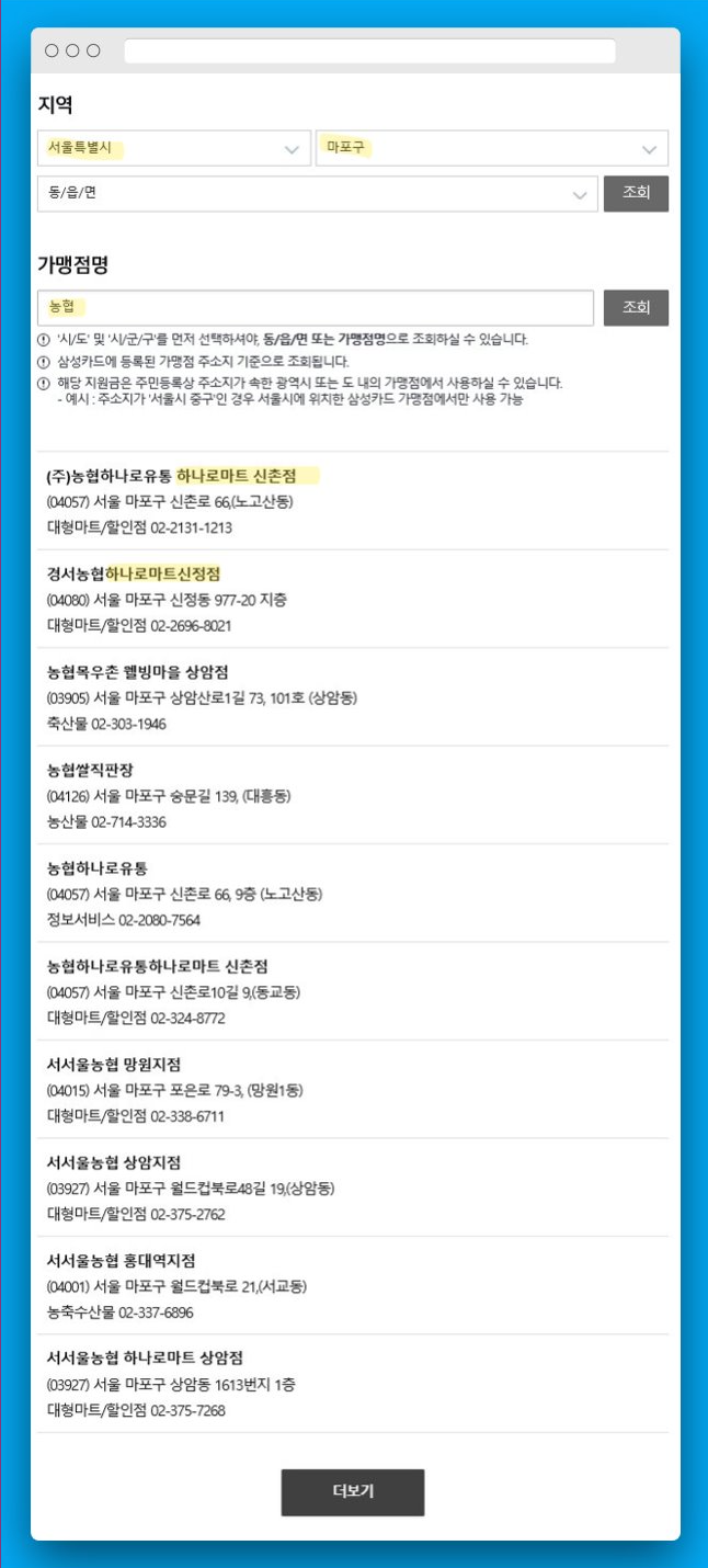예시 3. 농협 하나로마트도 검색해보았다. 이번에도 "시/군/구"까지 설정하고 "농협"으로 검색해보았다. 긴급재난지원금을 사용할 수 있는 농협 하나로마트가 뜬다. 이렇게 사용할 수 있는지 없는지 쉽게 알아볼 수 있다.